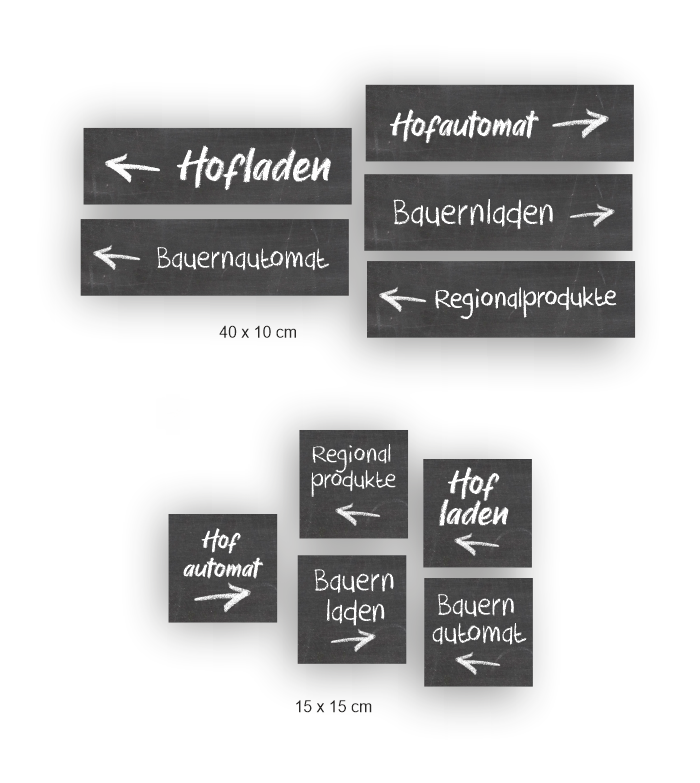Es gibt verschiedene Varianten, zum Beispiel Hofladen, Hofautomat, Bauernladen, Bauernautomat und Regionalprodukte. Mini-Werbetafeln mit Produkten wie Spargel, Erdbeeren, Milchprodukte, Käse usw. werden Anfang 2026 ins Sortiment aufgenommen. (Wenn Sie diese früher benötigen, nehmen Sie bitte kurz Kontakt mit uns auf.)